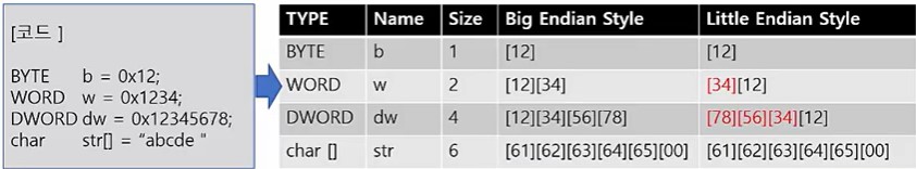 → 위 사진과 같이 총 4개의 크기가 다른 자료형이 있을때 바이트 타입의 변수를 저장할 때는 두 방식의 차이가 없지만, 2바이트 이상의 크기를 가진 자료형을 저장할 때에는 각 엔디언의 방식에 따라 저장방식에 차이가 생긴다.