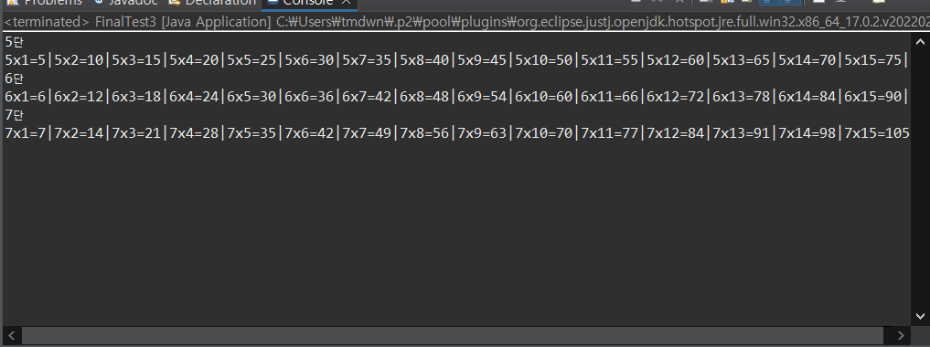 - 위 코드는 5 * 1 부터 7 * 15까지의 곱을 나타내는 식이다.
